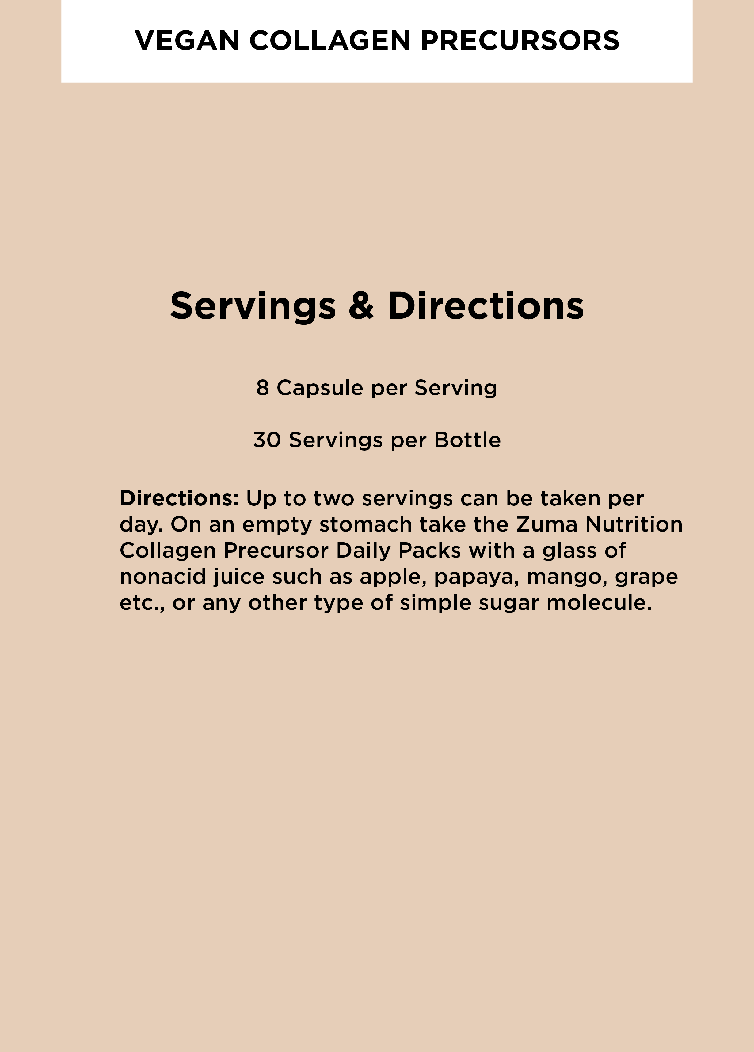 This combination of 8 capsules includes therapeutic dosage of specific amino acids and vitamins that have been clinically studied to support the body’s natural collagen production process. This is a vegan collagen health supplement that supports optimal skin and joint health from the inside out.